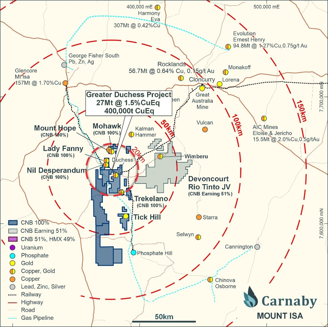 The Mineral Resource Estimate for the Greater Duchess Copper Gold Project, consisting of multiple mineral deposits, is derived primarily from the Prospects for 27Mt at 1.3% Cu, 0.2 g/t Au for 355kt Cu, 208koz, or 1.5% CuEq for 400kt CuEq. Potential pathways to production are currently being progressed, with a Pre-Feasibility study currently underway and tolling and off-take agreements with Glencore International AG in place. The Project is centrally located in a mining friendly jurisdiction and is surrounded by third party processing facilities and world class infrastructure including rail, road, gas pipeline and a highly experienced and mine ready workforce with abundant contract mining and haulage operators in the Mount Isa region.