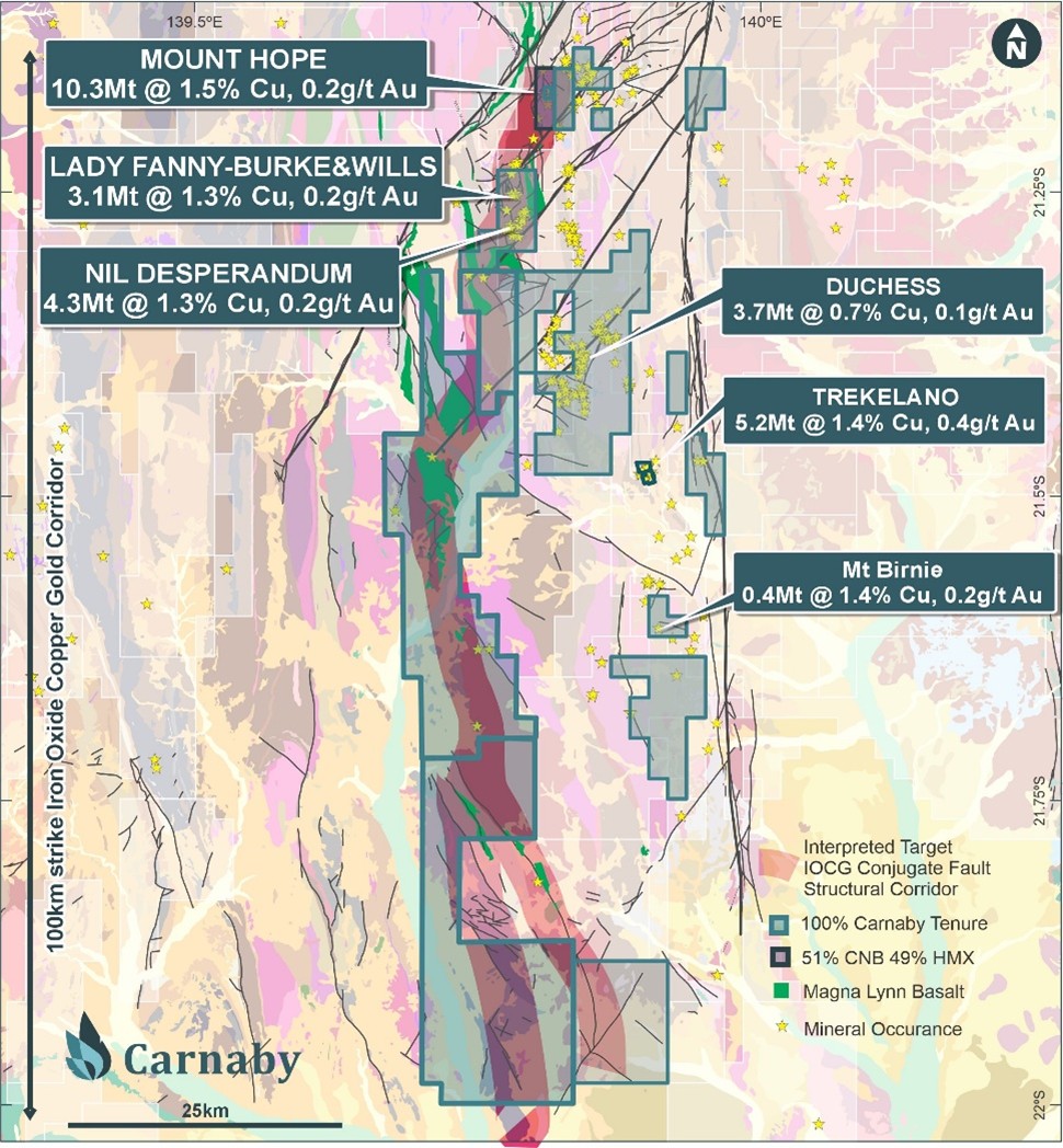 The Mount Hope, Nil Desperandum, and Lady Fanny deposits, as well as the recently acquired Trekelano deposits represent standout prospects (Prospects) within the Project, where broad high-grade copper mineralisation has been intersected at all four locations. The tenement package also includes the historical Duchess Copper-Gold Mine which produced approximately 205,000 t at 12.5% copper from 1900-1940 as well as numerous shallow IOCG deposits in a camp scale setting.