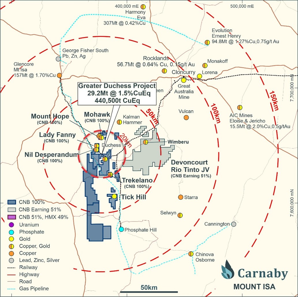 The Mineral Resource Estimate for the Greater Duchess Copper Gold Project, consisting of multiple mineral deposits, is derived primarily from the Prospects for 29.2Mt @ 1.3% Cu, 0.2g/t Au, 1.5% CuEq for contained 380kt Cu, 230koz Au and 441k CuEq. Potential pathways to production are currently being progressed, with a Pre-Feasibility study currently underway and tolling and off-take agreements with Glencore International AG in place. The Project is centrally located in a mining friendly jurisdiction and is surrounded by third party processing facilities and world class infrastructure including rail, road, gas pipeline and a highly experienced and mine ready workforce with abundant contract mining and haulage operators in the Mount Isa region.