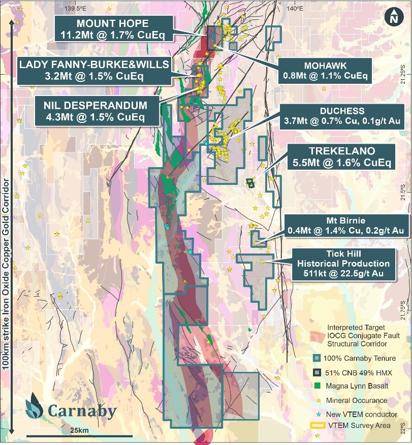 The Mount Hope, Nil Desperandum, and Lady Fanny deposits, as well as the recently acquired Trekelano deposits represent standout prospects (Prospects) within the Project, where broad high-grade copper mineralisation has been intersected at all four locations. The tenement package also includes the historical Duchess Copper-Gold Mine which produced approximately 205,000 t at 12.5% copper from 1900-1940 as well as numerous shallow IOCG deposits in a camp scale setting.